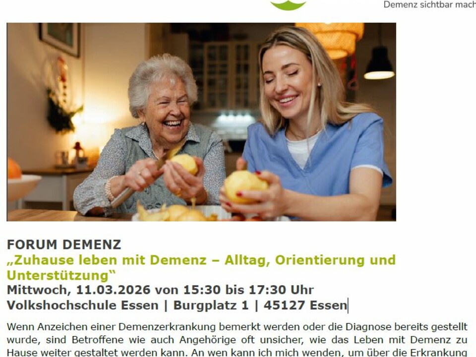Wenn Anzeichen einer Demenzerkrankung bemerkt werden oder die Diagnose bereits gestellt wurde, sind die Betroffenen wie auch die Angehörigen in dieser Situation oft unsicher, wie das Leben mit Demenz zu Hause weiter gestaltet werden kann: An wen kann ich mich wenden um über die Erkrankung und Möglichkeiten der Unterstützung zu sprechen? Was kann im Alltag hilfreich sein und die Selbstständigkeit unterstützen? Was passiert eigentlich in einer Tagespflege? Diese und weitere Fragen werden in der Veranstaltung des Netzwerk Demenz am Mittwoch, 11.03.2026 von 15:30 bis 17:30 Uhr in der Volkshochschule Essen, Burgplatz 1, 45127 Essen angesprochen. Auf dem Podium werden verschiedene Ansprechpartner*innen aus dem Bereich Pflege und Beratung vertreten sein. Pflegende Angehörige kommen zu Wort und es gibt Raum für persönliche Gespräche an den Infoständen.“