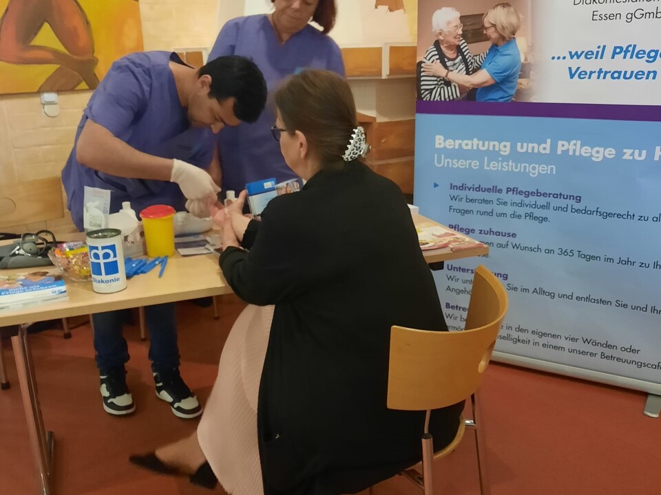 Am Mittwoch, 14. Mai, fand auf Initiative des Runden Tisches Senioren Katernberg im Bürgerzentrum Kon-Takt am Katernberger Markt von 10 bis 13 Uhr der 17. Katernberger Senioren-Infotag statt. Gelegenheit für uns, unsere Leistungen der ambulanten Pflege zu präsentieren. Das Team der Diakoniestationen Essen Team Nordost war vor Ort und konnte Interessierten in Gesprächen unsere Betreuungs- und Pflegeleistungen erläutern. Wenn gewünscht konnte auch Blutdruck und Blutzucker gemessen werden.