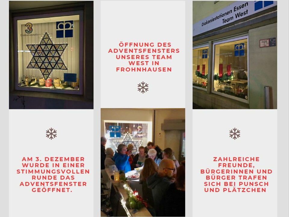 Am 3. Dezember wurde in einer stimmungsvollen Runde das Adventsfenster unserer Diakoniestationen Essen gGmbH Team West in Frohnhausen geöffnet. Zahlreiche Freunde und Anwohnerinnen und Anwohner trafen sich bei Punsch und Plätzchen, haben Weihnachtslieder gesungen und gemeinsam einen besinnlichen Abend verbracht. Der Weihnachtsstern wurde von unseren Kundinnen und Kunden im Betreuungscafé Frohsinn und in der Tagespflege der Adolphi-Stiftung gestaltet.