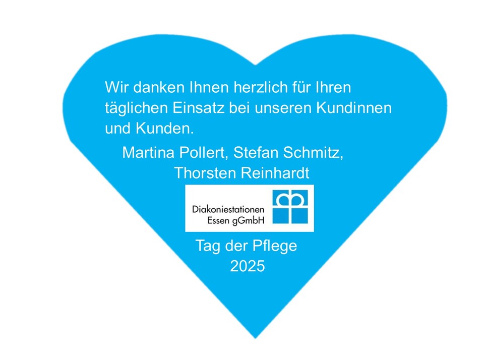 Unseren Mitarbeitenden in der Pflege und Verwaltung der Diakoniestationen Essen gGmbH, die Tag für Tag mit Herz, Menschlichkeit und Engagement dafür sorgen, dass ältere und kranke Menschen in Essen gut versorgt sind. DANKE!