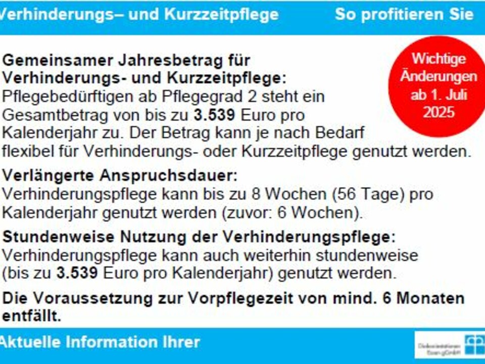 Ab dem 1. Juli 2025 können pflegebedürftige Menschen ab Pflegegrad 2 die Leistungen der Verhinderungs- und Kurzzeitpflege über einen “Gemeinsamen Jahresbeitrag” nutzen. Der Betrag von 3.539 Euro pro Kalenderjahr kann dann für beide Pflegeformen verwendet werden. Diese Neuerung ermöglicht mehr Flexibilität, da das Budget nach Bedarf auf Verhinderungspflege (die genutzt wird, wenn die pflegende Person vorübergehend verhindert ist) und Kurzzeitpflege (vorübergehender stationärer Aufenthalt der pflegebedürftigen Person) aufgeteilt werden kann. Der “Gemeinsame Jahresbetrag” soll insbesondere pflegende Angehörige unterstützen, indem es ihnen größere Entscheidungsfreiheit und Entlastung bietet, ohne die finanzielle Unterstützung für Kurzzeit- oder Verhinderungspflege separat beantragen zu müssen. Gerne können Sie die Verhinderungspflege auch weiterhin stundenweise in Anspruch nehmen. Ab dem 01.07.2025 entfällt hier die Vorpflegezeit von 6 Monaten.