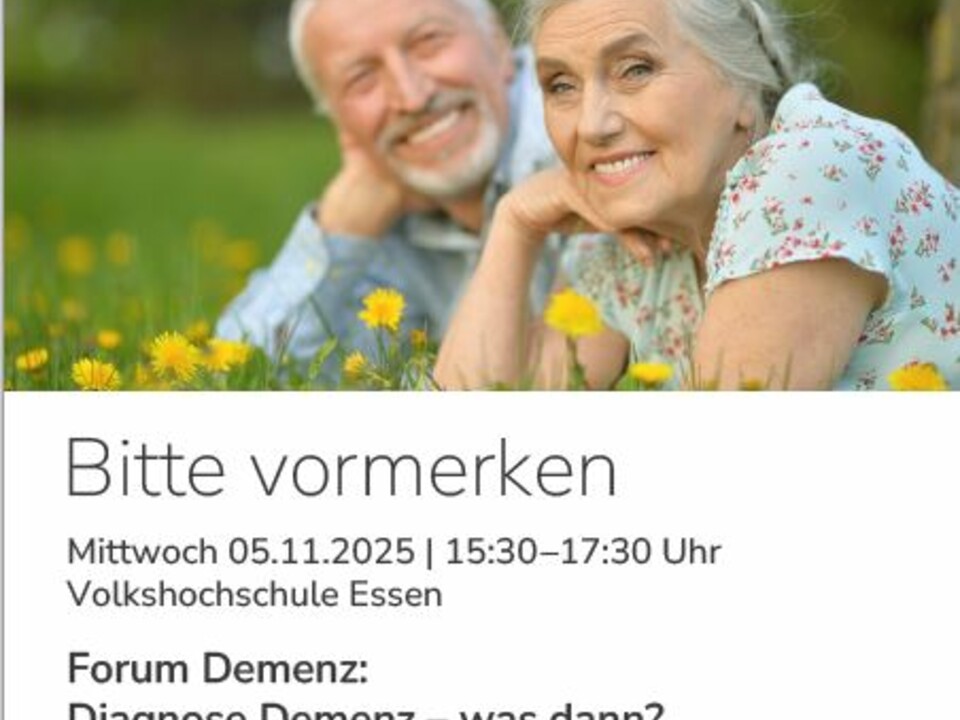 Zu einem Forum mit dem Thema „Diagnose Demenz – was dann?“ lädt das Netzwerk am Mittwoch, den 5. November 2025, von 15.30 – 17.30 Uhr in die Volkshochschule Essen, Burgplatz 1 ein.