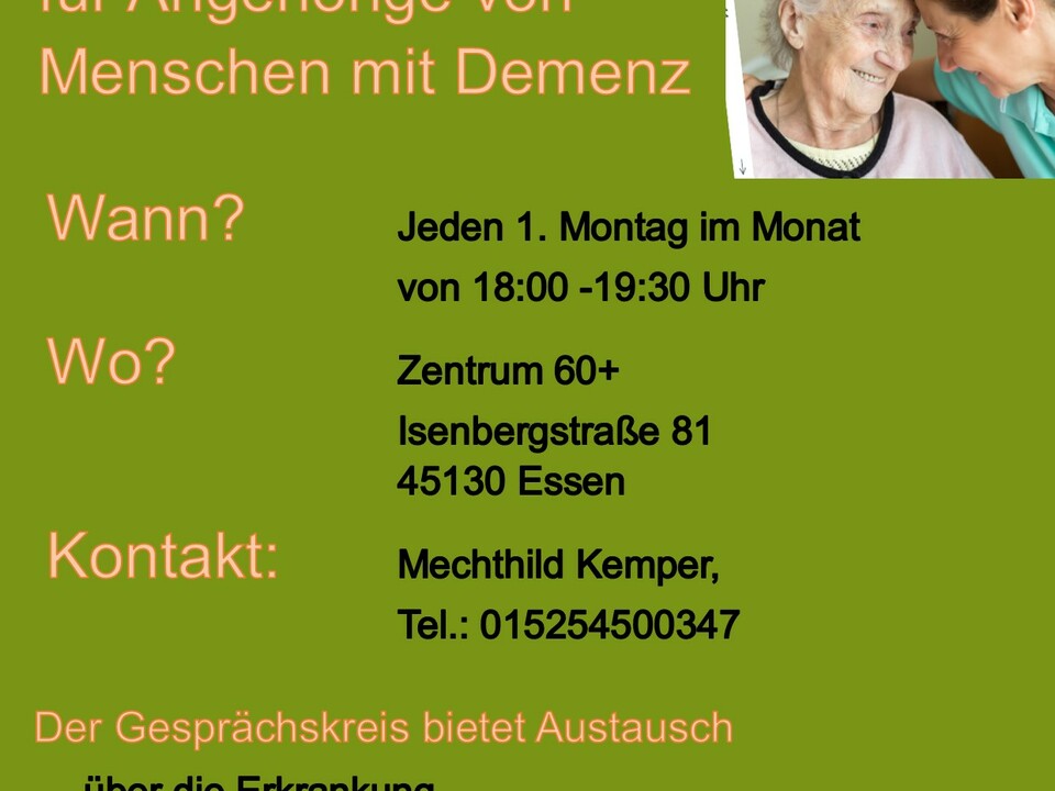 Jeden 1. Montag im Monat von 18:00 -19:30 Uhr findet im Zentrum 60+, Isenbergstraße 81, 45130 Essen ein Gesprächskreis für Angehörige von Menschen mit Demenz statt.