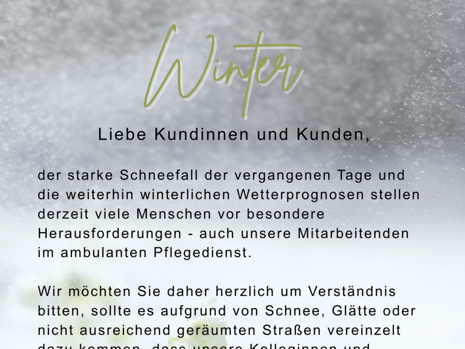der starke Schneefall der vergangenen Tage und die weiterhin winterlichen Wetterprognosen stellen derzeit viele Menschen vor besondere Herausforderungen - auch unsere Mitarbeitenden im ambulanten Pflegedienst.