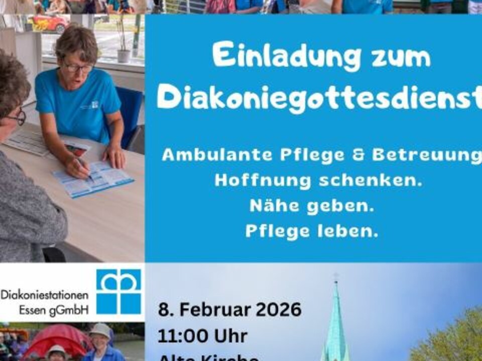 findet am 8. Februar 2026 um 11:00 Uhr in der Alten Kirche in Altenessen ein Diakoniegottesdienst in Zusammenarbeit zwischen der Kirchengemeinde Altenessen, dem Evangelischen Altenzentrum am Emscherpark e.V. und dem Team Nordost der Diakoniestationen Essen gGmbH statt.